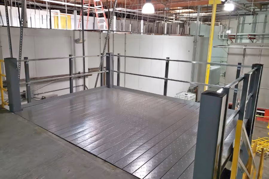 The mezzanine would need to be designed to match up cleanly with their existing platform floor and to fit between existing walls and obstructions since this was an active manufacturing facility.